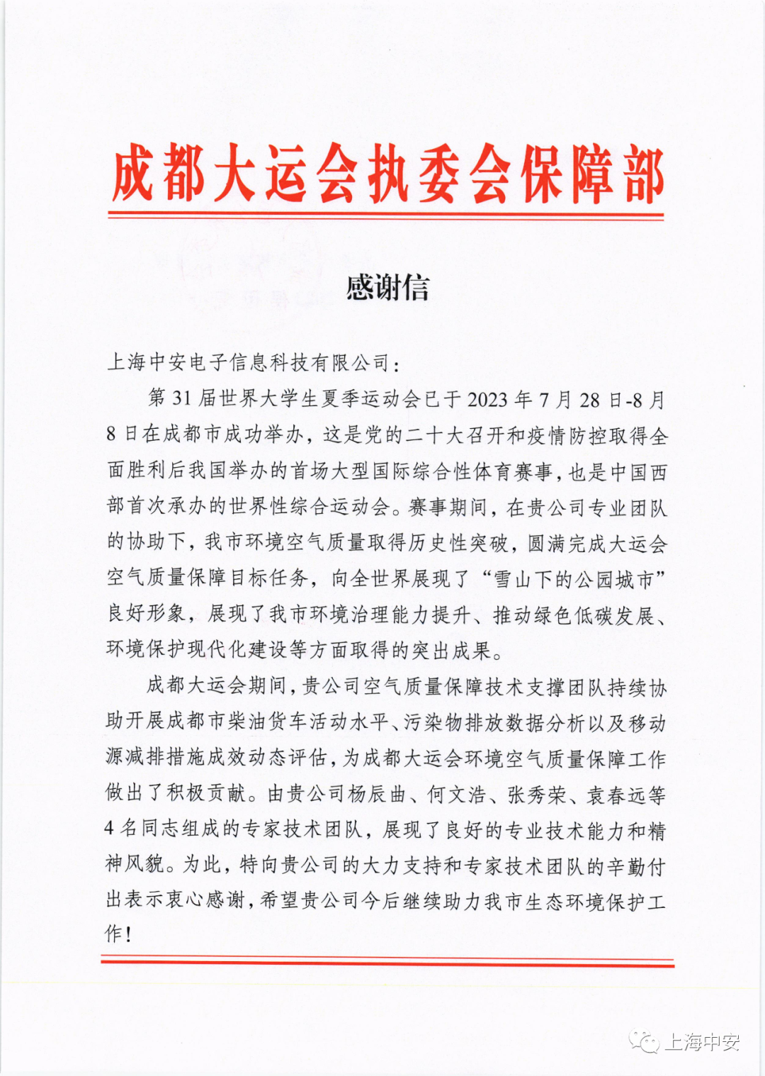 中安科技圓滿完成第31屆世界大學生夏季運動會空氣質(zhì)量保障任務?。?023-10-9)